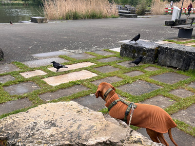 In der Grün 80 hat es gaaaaanz viele Krähen, Enten und Schwäne🤪 und natürlich auch viele spannende Gerüche und viele fremde Menschen. Da es immer noch viel zu kalt für mich ist, hat mir die Mema meinen Pullover angezogen. Der ist zwar noch etwas zu gross, aber herrlich weich. Wenn ich herumrennen kann, dann brauche ich keinen Pullover. Nur wenn ich an der Leine gehen soll und daher auch laaaaaangsam unterwegs bin, dann kommt zur Aufregung noch das Fösteln und so auch wieder mehr Bewegungsdrang und Hektik 😝🥶. Tatsächlich soll ich ja aber in Ruhe alles um mich herum wahrnehmen können und da hilft mir die Aufregung und Kälte nicht.